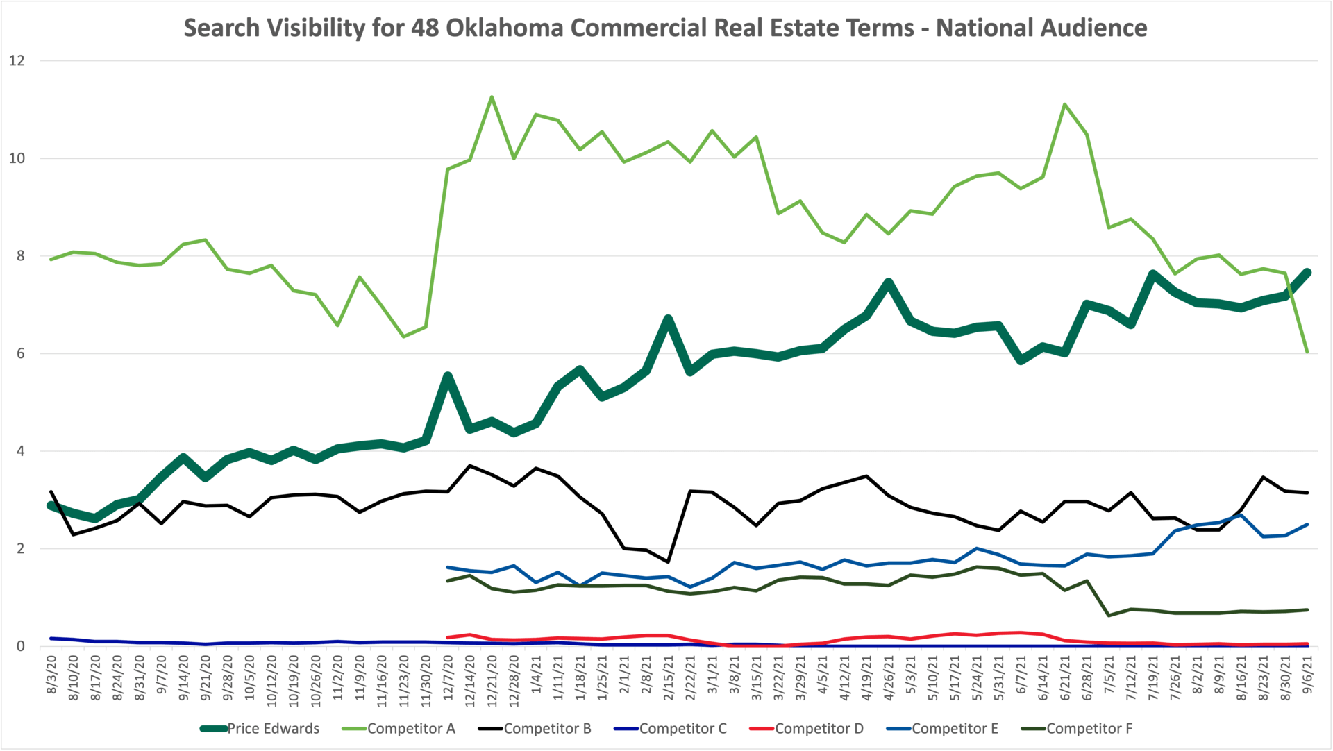 Success in real estate is all about connecting the right people with the right property. At Price Edwards, we are pretty good at it. Since we started in 1988, we’ve been a consistent market leader. The way we have been able to make these connections has been to take talented brokers and pair them with the best technology and support. The number one way we get deals done, whether they are leases or sales transactions, is the relationships our brokers make and the effort they put in marketing our clients’ properties. That is not changing. What is changing is where some of our leads come from….more and more are coming from online sources. To capture this market, we’ve focused significant time and money on our online presence through our website, social media and industry specific platforms. Recognizing the importance of SEO (search engine optimization), we track 48 of the most nationally used and 28 of the most locally used real estate search terms. Price Edwards ranks at the top both locally and nationally (see the attached chart).